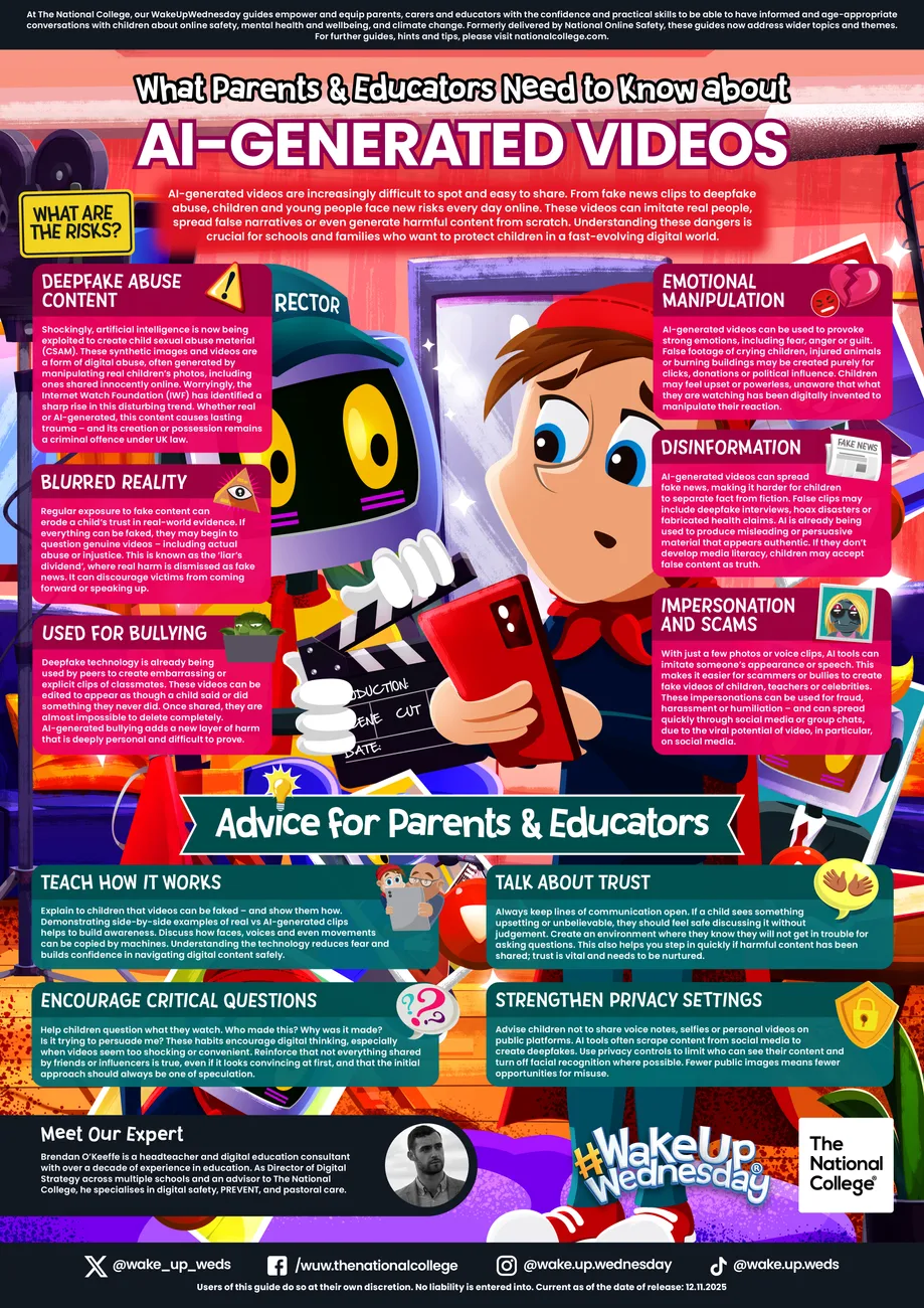 AI can now generate realistic looking videos that are almost impossible to distinguish from genuine content. From hoax news to abusive deepfakes, these synthetic clips can mislead, manipulate and even harm. As AI tools become more advanced, and more accessible, young people are increasingly at risk of encountering fake but convincing footage online. This #WakeUpWednesday guide unpacks the dangers of AI-generated videos, from the emotional impact of fake distressing content to the potential for impersonation and bullying. With practical tips to help young users spot deepfakes and navigate online spaces with confidence, this guide is an essential read for parents and educators navigating this rapidly evolving digital landscape.